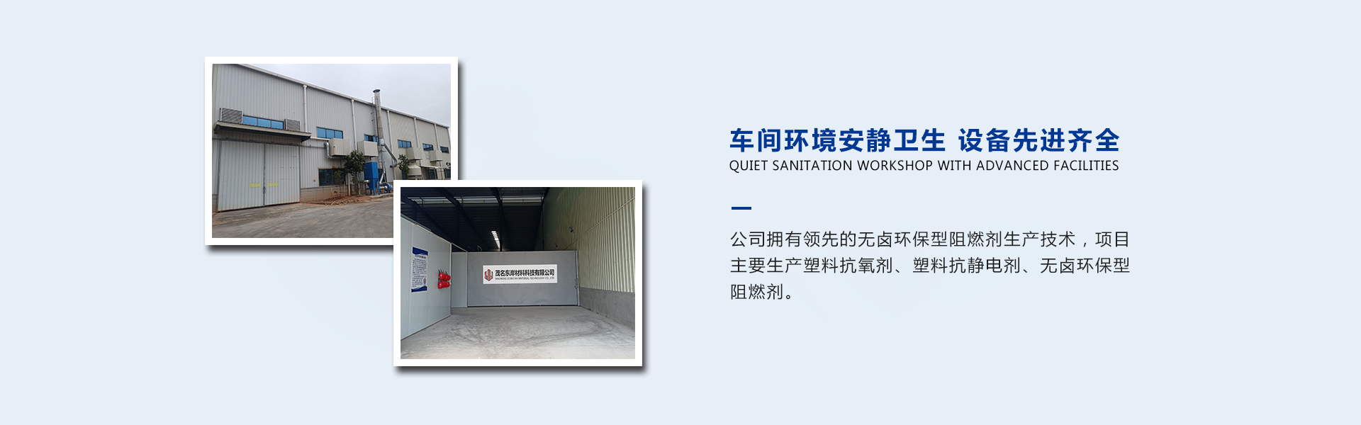 茂名東岸材料科技有限公司是一家主要從事抗靜電劑、無鹵環(huán)保型阻燃劑、聚烯烴成核劑等新材料研發(fā)生產(chǎn)的高科技技術(shù)公司,是由無鹵環(huán)保型阻燃劑研發(fā)者創(chuàng)立,核心技術(shù)團隊有3位博士,是中國重要的無鹵環(huán)保型阻燃新材料生產(chǎn)企業(yè)之一。公司擁有無鹵環(huán)保型阻燃劑生產(chǎn)技術(shù),項目主要生產(chǎn)塑料抗氧劑、塑料抗靜電劑、無鹵環(huán)保型阻燃劑。